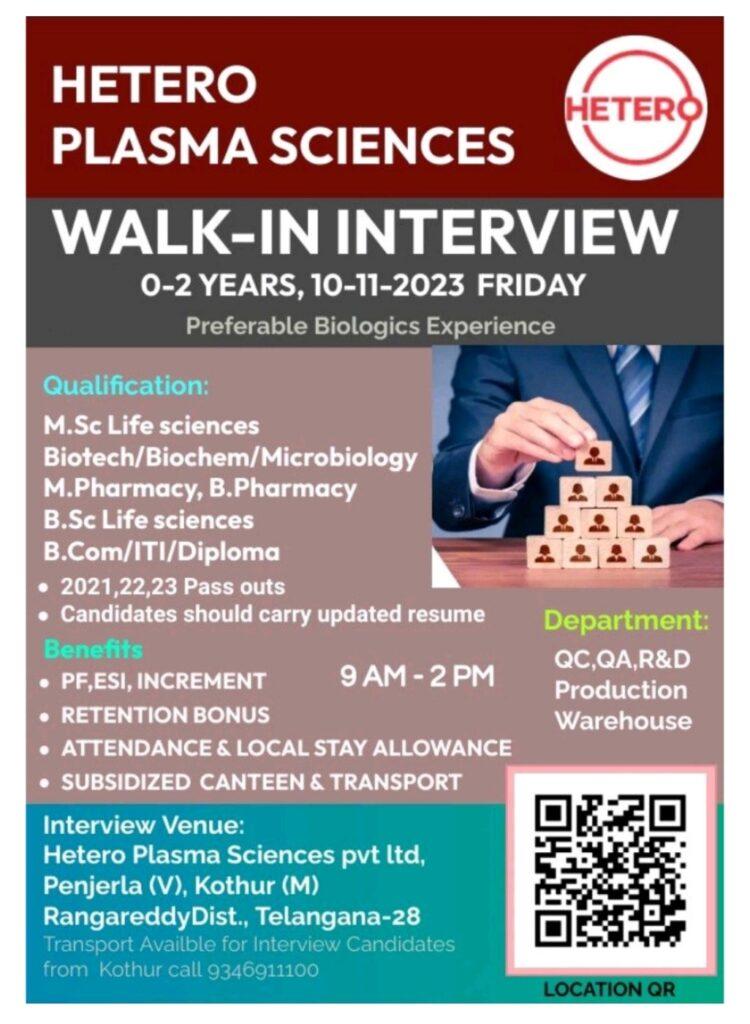 Hetero Plasma Sciences Walk In Interview for QC, QA, R&D, Production, Warehouse on 10th Nov 2023 | Freshers