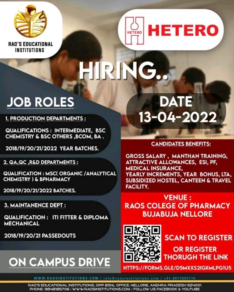 Hetero Walk In Interview for BSc, MSc, Bcom, Bpharmacy, Mpharmacy Freshers for Production, QA,QC,R&D, Maintenance on 13th April 2022