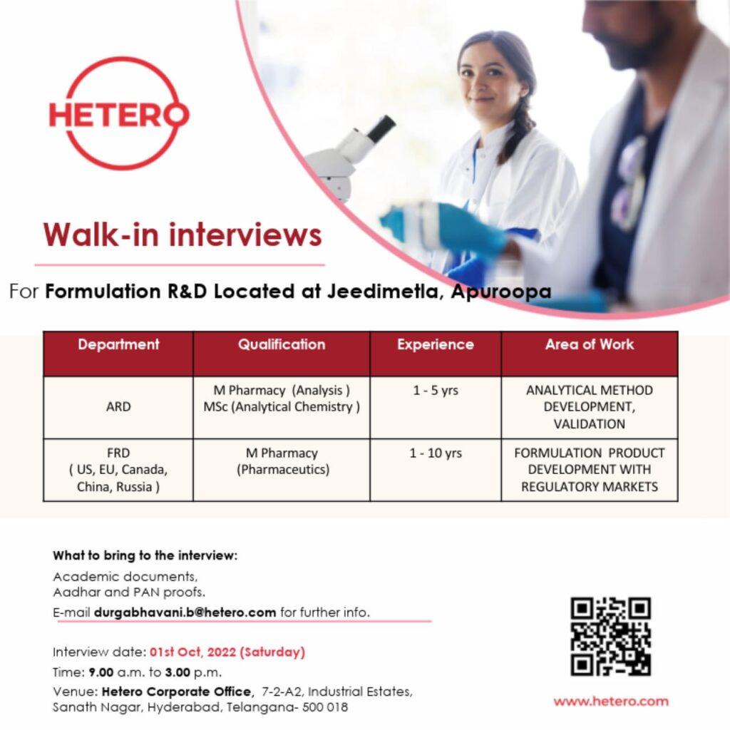 HETERO Walk In Interview for Formulation R&D- ARD, FRD department on 01st Oct, 2022