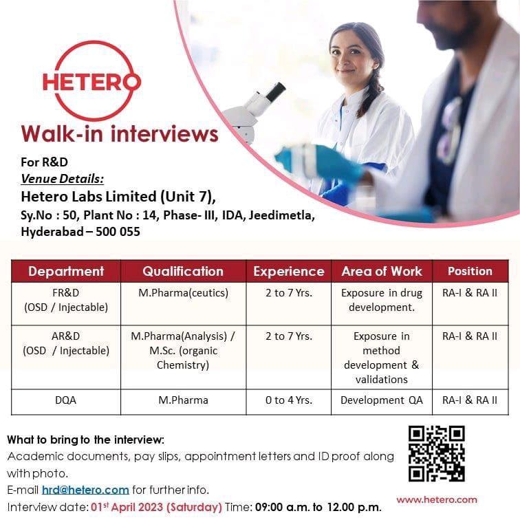 HETERO- Walk In Interview for Freshers & Experience- FR&D, AR&D (OSD/Injectable), DQA on 01st April 2023