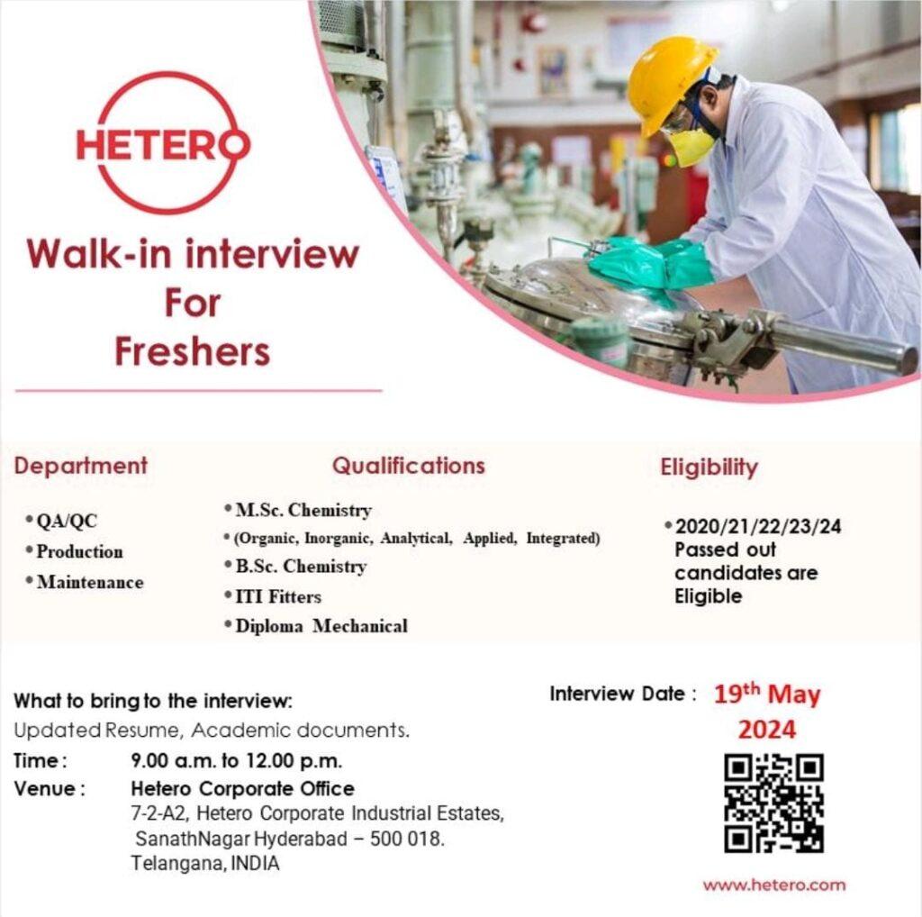HETERO Walk-in interview For Freshers in QA/QC, Production & Maintenance on May 19th 2024