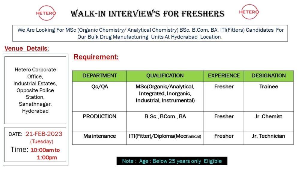 HETERO- Walk In Interview for FRESHERS in QC/ QA/ PRODUCTION/ Maintenance on 21-Feb-2023
