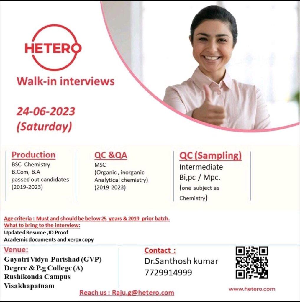 HETERO Walk in Interview for Production, QA, QC department on 24-06-2023 (Saturday)