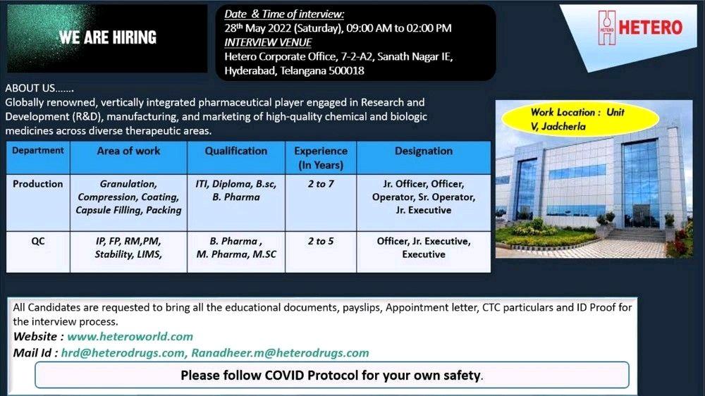Hetero Walk In Interview for Production & QC on 28th May 2022