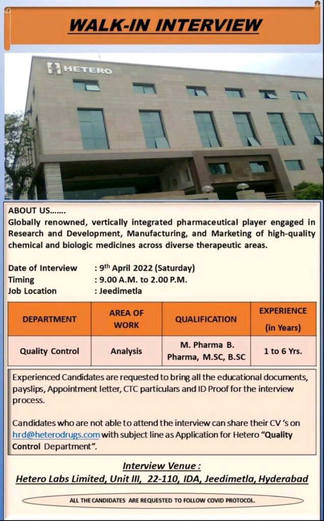 Candidates who are not able to attend the interview can share their CV’s on hrd@heterodrugs.com with subject line as Application for Hetero “Quality Control Department”.