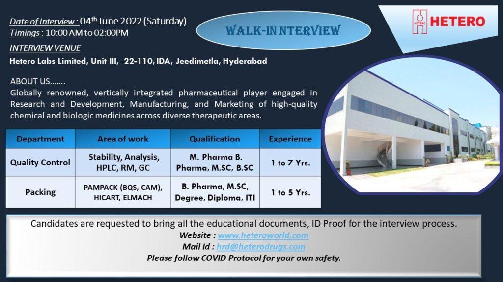 Hetero Walk In Interview for Quality Control, Packing department on 04th June 2022