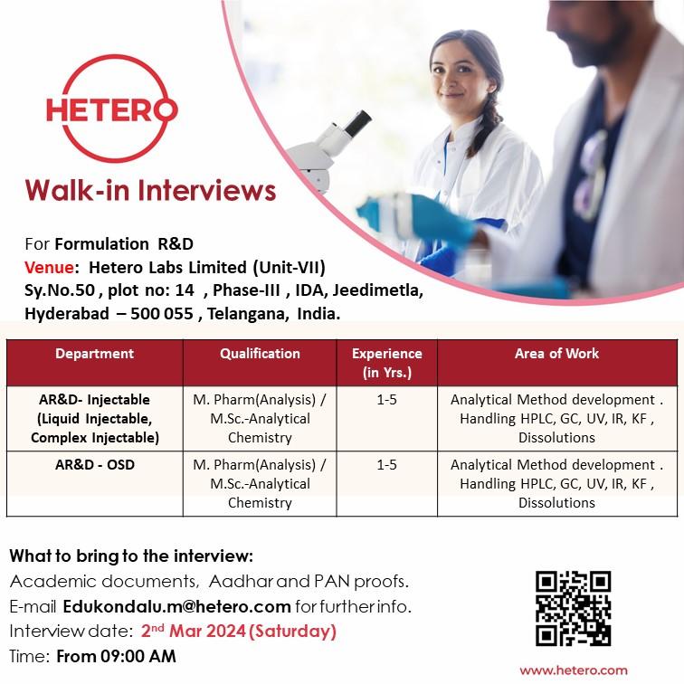 HETERO Walk-in Interviews for AR&D- Injectable (Liquid Injectable, Complex Injectable) & AR&D – OSD || 2nd Mar 2024 (Saturday)