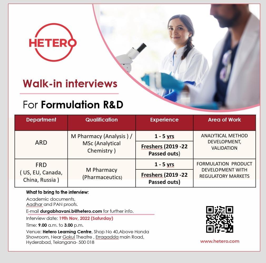 HETERO Walk-in interviews For Formulation R&D – ARD / FRD (US, EU, Canada, China, Russia) on 19th Nov 2022|| 1-5 yrs/ Freshers (2019-22 Passed outs)