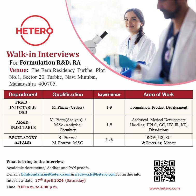 HETERO Walk-in Interviews For Formulation R&D, RA on 27th April 2024