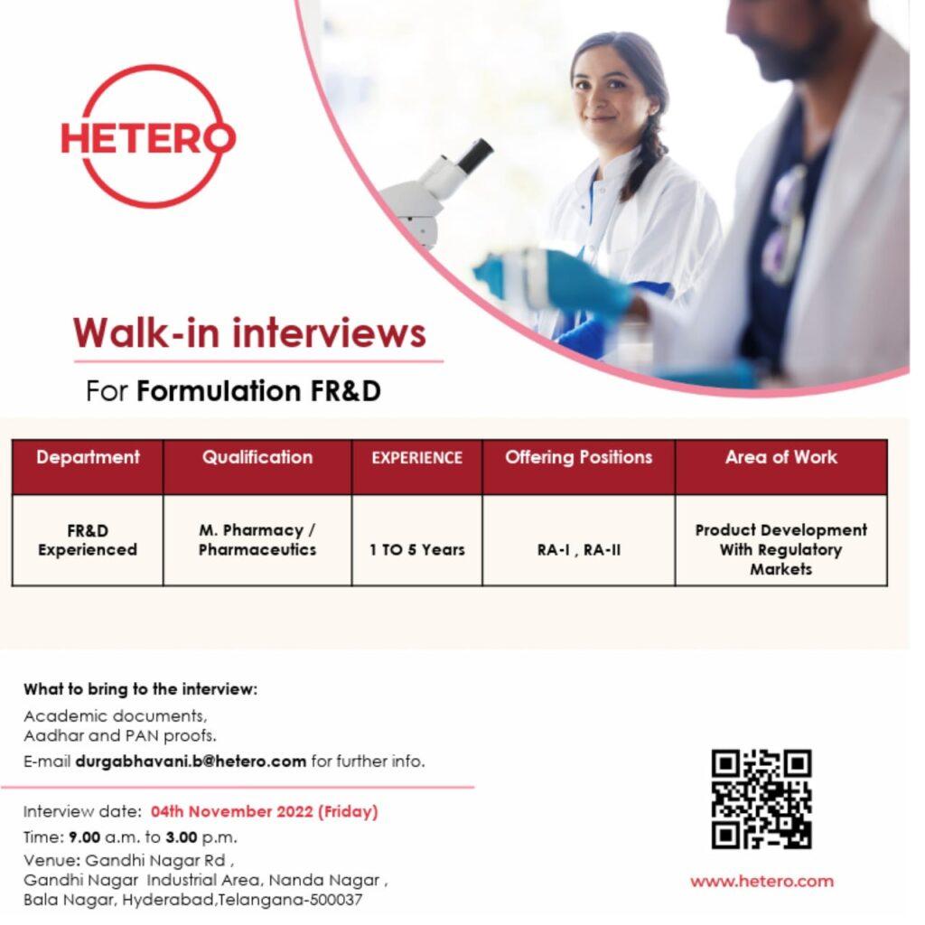 HETERO Walk-in interviews for FR&D Experienced candidate on 04th November 2022