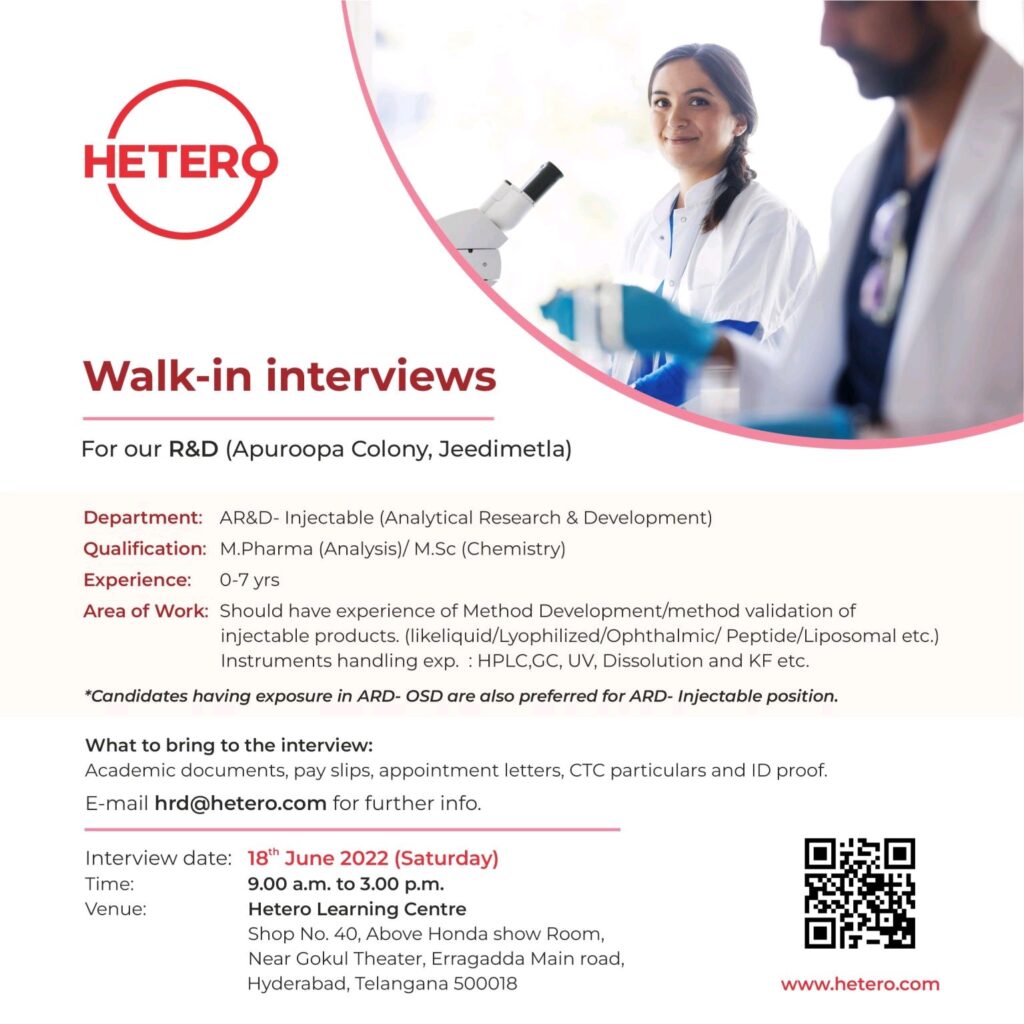 Hetero Walk-in interviews for Freshers & experience in AR&D- Injectable department on 18th June 2022