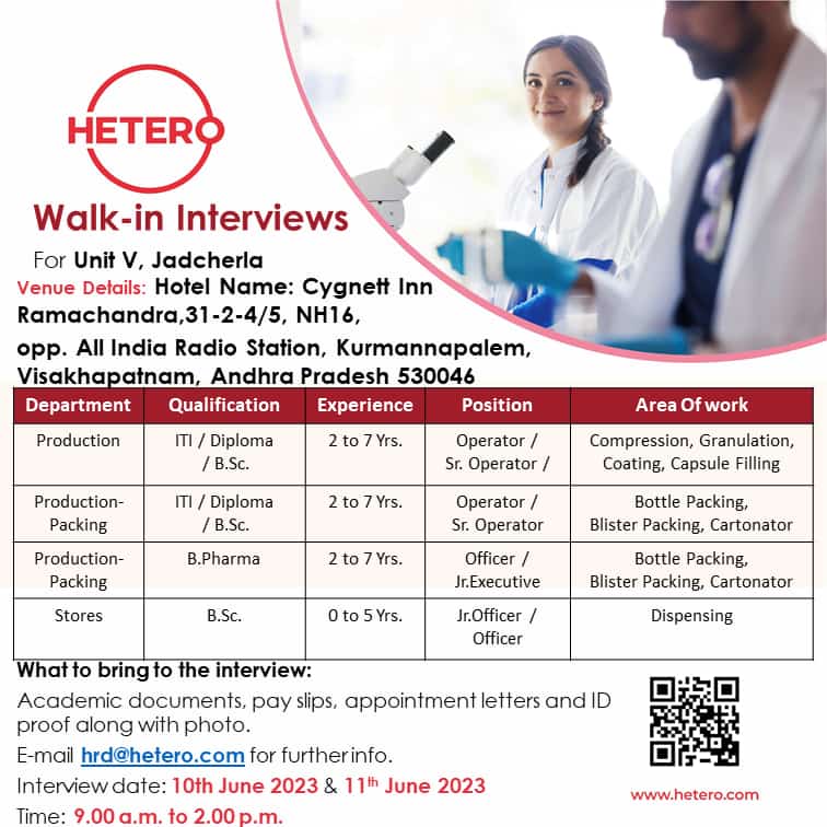 HETERO- Walk-in Interviews for Operator / Sr. Operator/ Jr.Officer/ Officer/ Jr. Executive – Production, Production- Packing, Stores on 10th & 11th June 2023