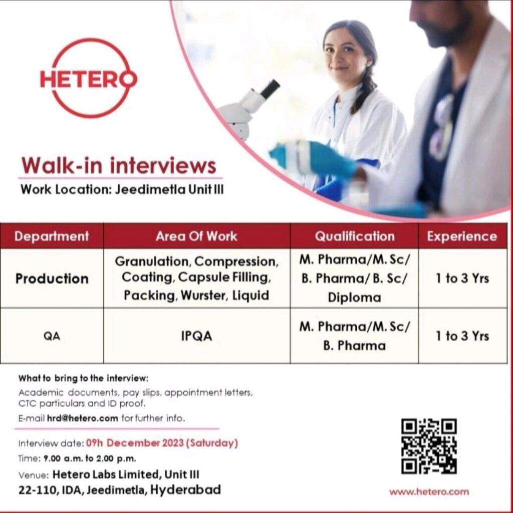 HETERO Walk-in interviews for Production, QA on 09h December 2023 |Jeedimetla Unit III