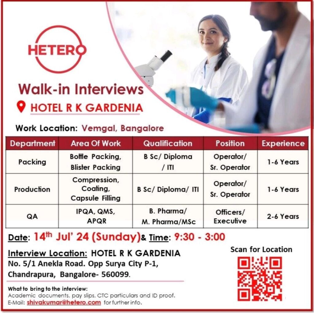 HETERO Walk-in Interviews for QA, Production & Packing on 14th Jul’ 24 (Sunday)