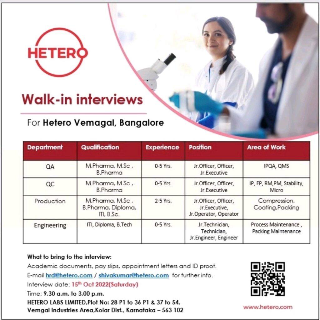 Hetero Walk-in interviews for QA, QC, Production & Engineering department on 15th Oct 2022– freshers & experience