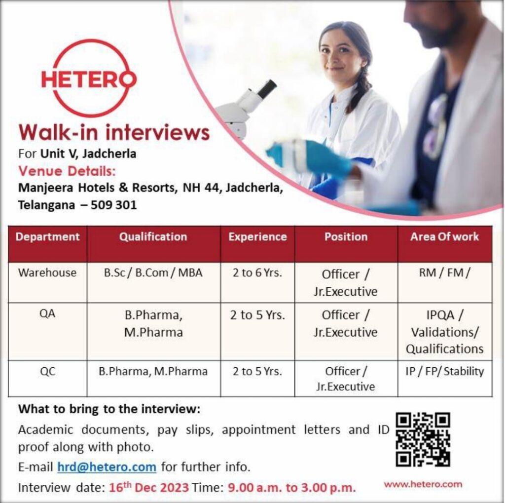 HETERO Walk-in interviews For Unit V, Jadcherla on 16th Dec 2023 |Warehouse, QA, QC department