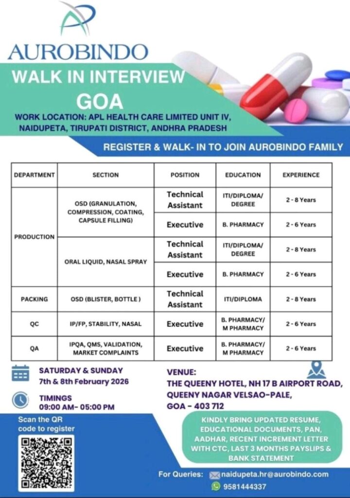 Are you looking to advance your career with one of India’s leading pharmaceutical giants? Aurobindo Pharma (APL Health Care Limited) has announced a major walk-in recruitment drive in Goa this February. This is a prime opportunity for experienced professionals in the pharmaceutical sector to join a global healthcare leader at their Naidupeta facility.