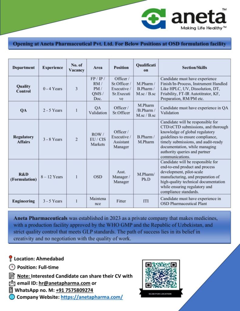 We are seeking talented and experienced professionals to join our OSD (Oral Solid Dosage) Formulation facility in Ahmedabad for full-time positions.