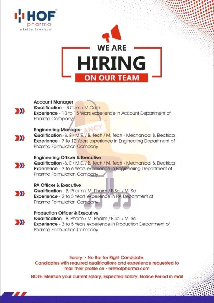 HOF Pharma hiring for Account Manager, Engineering Officer, Executive & Manager, RA Officer & Executive, Production Officer & Executive- Apply now
