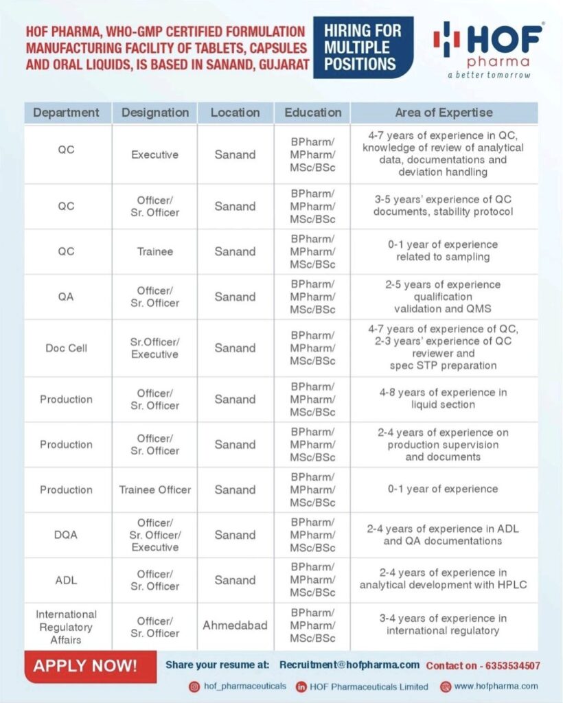HOF Pharma, a WHO-GMP certified formulation manufacturing facility specializing in tablets, capsules, and oral liquids, has announced an extensive recruitment campaign for various positions across its operations in Gujarat. The company, operating under the tagline “a better tomorrow,” is seeking experienced pharmaceutical professionals to strengthen its workforce at its Sanand and Ahmedabad facilities.