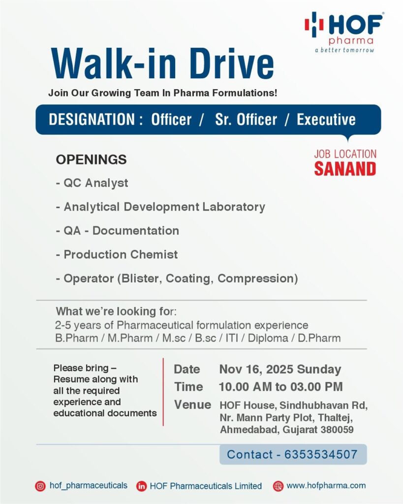 Join HOF Pharma and become a part of their growing team in Pharma Formulations! We are hosting a Walk-in Drive for dynamic and experienced professionals for Officer, Sr. Officer, and Executive level positions at our Sanand facility in Gujarat.