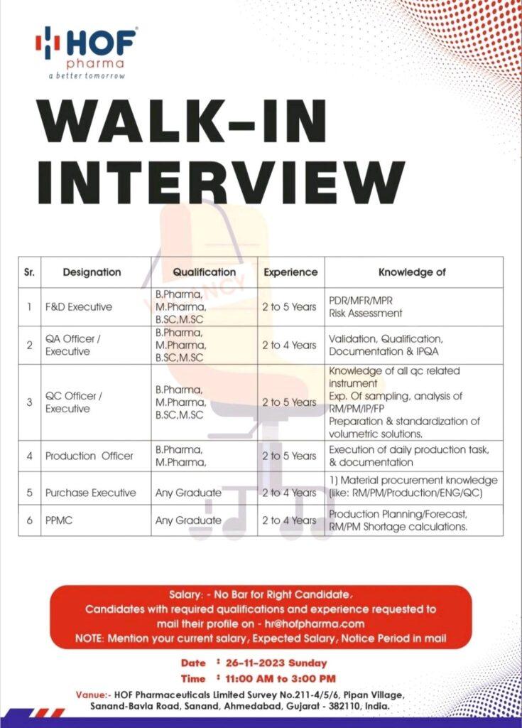 HOF Pharmaceuticals job vacancy for F&D, QA, QC, Production, Purchase, PPMC | Walk In Interview on 26-11-2023 Sunday