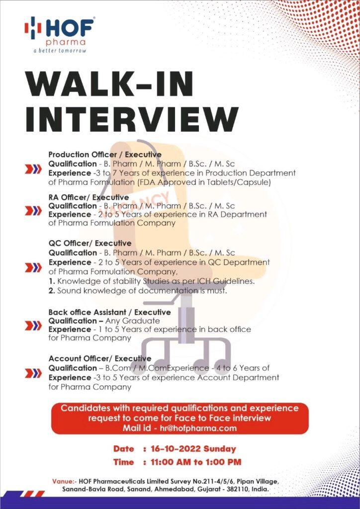 HOF Pharmaceuticals Walk In Interview for Assistant/ Officer / Executive in Production, RA, QC, Account & Back office 16th October 2022