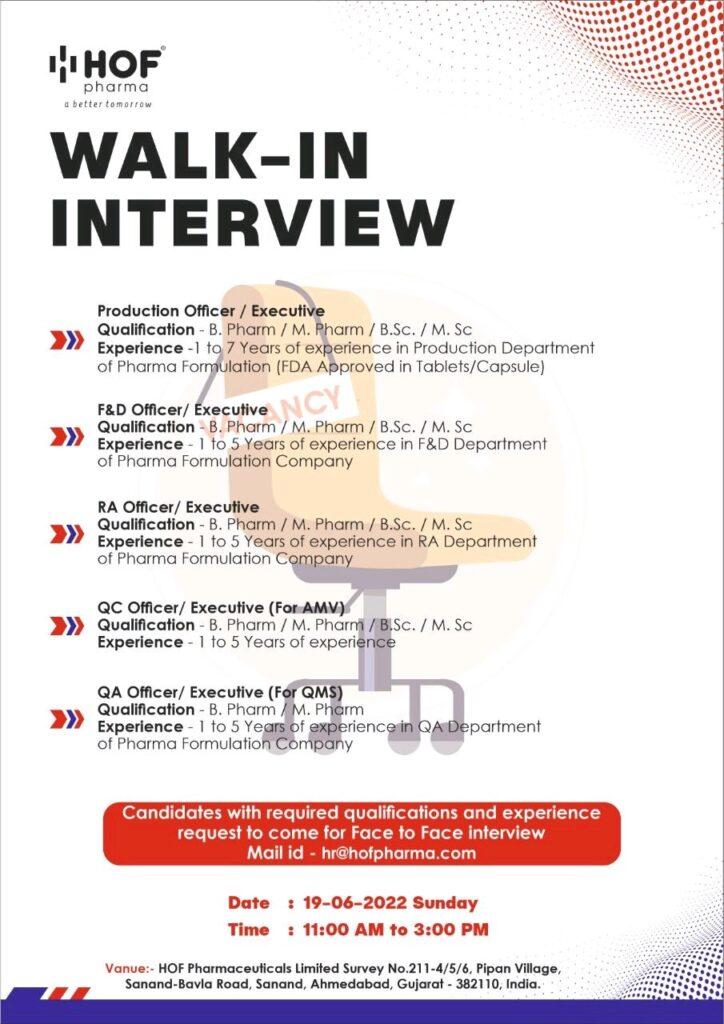HOF Pharmaceuticals Walk In Interview for Production, F&D, RA, QC & QA on 19th June 2022