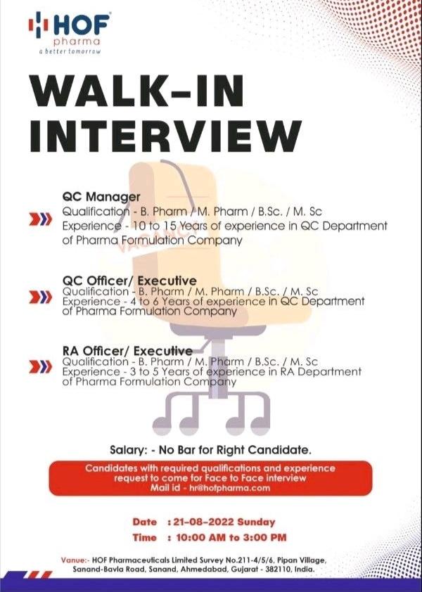 HOF Pharmaceuticals Walk In Interview for QC Manager/ Officer/ Executive, RA Officer/ Executive on 21st Aug 2022