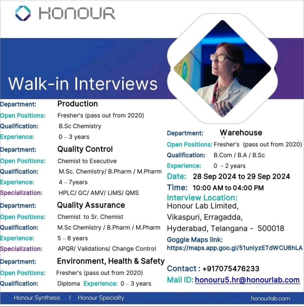 Honour Lab Limited Walk-in Interviews for Freshers & experience in QA, QC, Production, Warehouse & EHS on 28 Sep 2024 to 29 Sep 2024