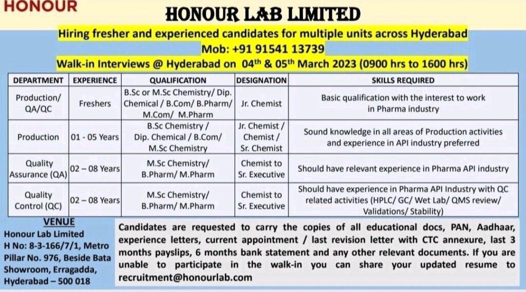 HONOUR LAB LIMITED- Walk-in Interviews for FRESHERS & Experience in Production/ QA/ QC @ Hyderabad on 04th & 05th March 2023