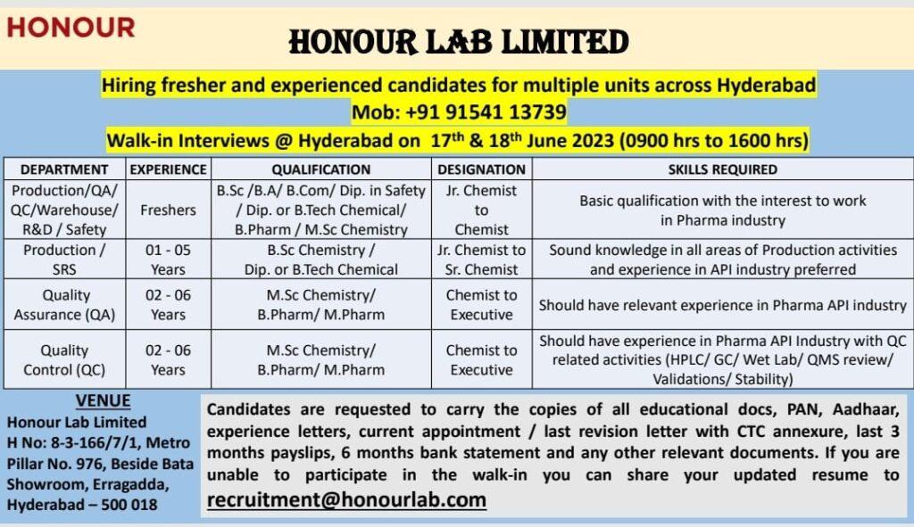 Honour Lab Limited – Walk-in Interviews @ Hyderabad on 17th & 18th June 2023 | Production/ QA/ QC/ Warehouse/ R&D/ Safety |Freshers/ 01-06 Years