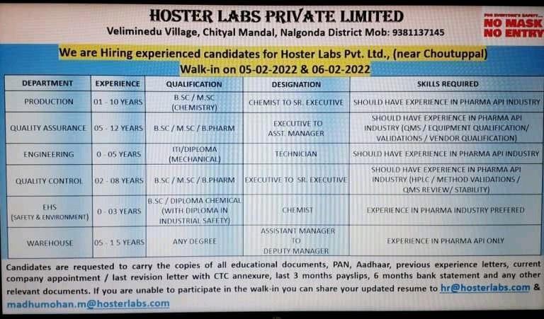 Hoster Labs Pvt. Ltd, Walk-In Interviews for QC / QA / Production / EHS / Warehouse/ Engineering department on 5th & 6th Feb’ 2022