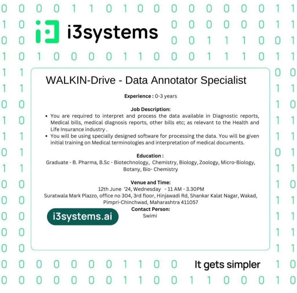 i3systems WALKIN-Drive for Data Annotator Specialist on 12th June 24, Wednesday [Experience: 0-3 years] Life-science candidates