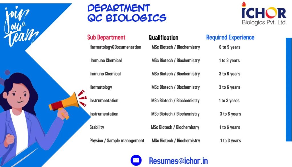 ICHOR Biologics Pvt. Ltd. Multiple openings in QC Biologics department