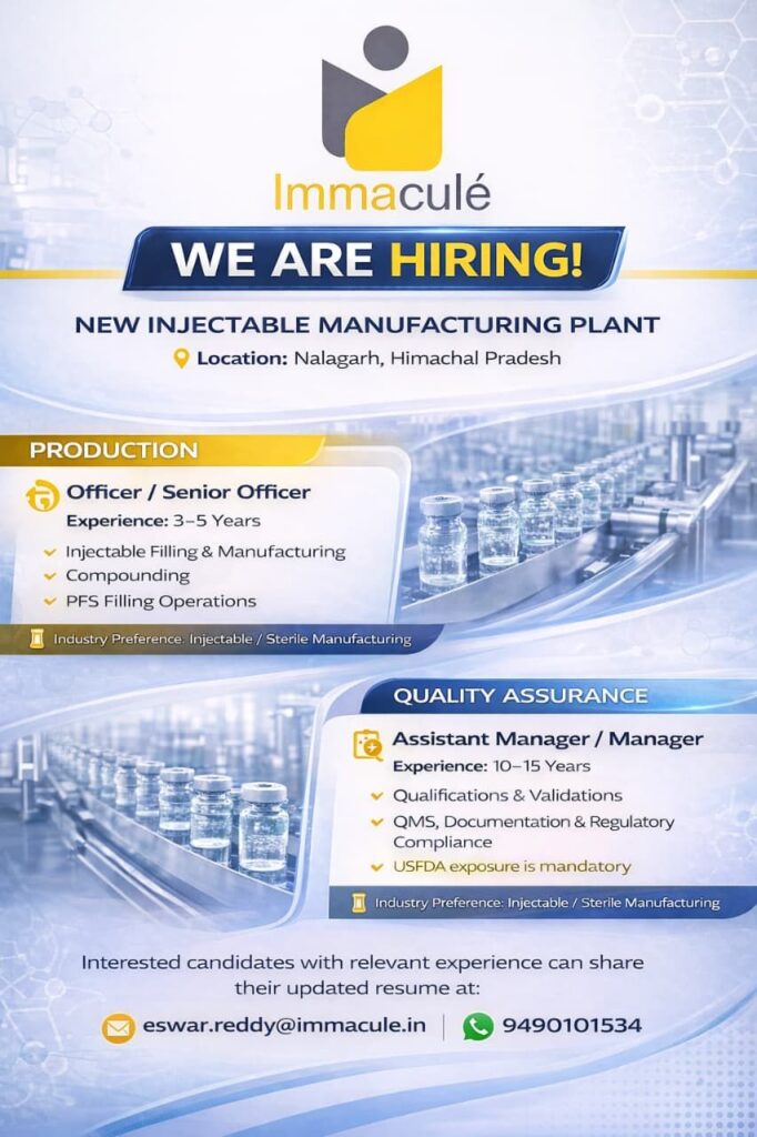 Immaculé, a growing name in the pharmaceutical sector, has announced a major recruitment drive for its new injectable manufacturing facility located in Nalagarh, Himachal Pradesh. This expansion marks a significant step for the company, and they are looking for experienced professionals to join their production and quality assurance teams.