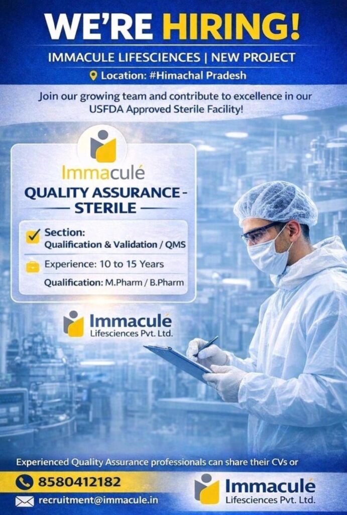 Immacule Lifesciences Pvt. Ltd. has announced a significant hiring drive for its new project in Himachal Pradesh. The company is actively seeking seasoned professionals to join its growing team within its USFDA Approved Sterile Facility. This is a premier opportunity for senior-level pharmaceutical experts to contribute to a high-standard manufacturing environment focused on excellence and global compliance.