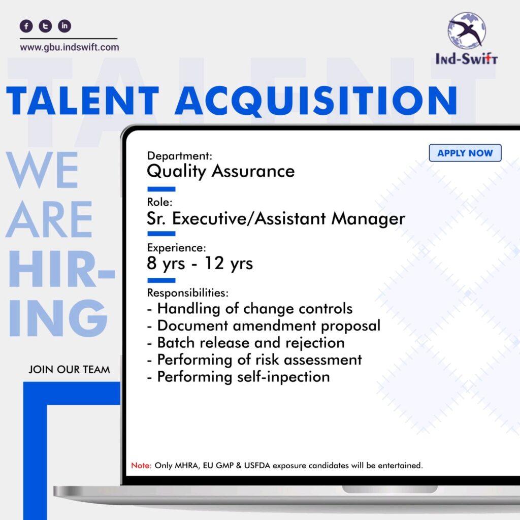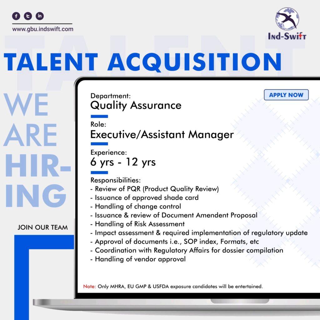 Ind-Swift-Laboratories Ltd. Multiple opening for Executive/ Sr. Executive/ Assistant Manager- Quality Assurance department