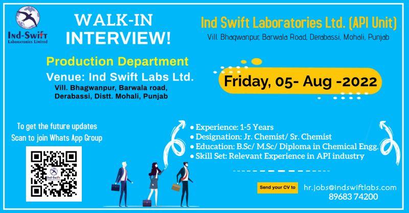 Ind-Swift-Laboratories Ltd. Walk In Drive for Production Department on Friday, 5th Aug 2022.