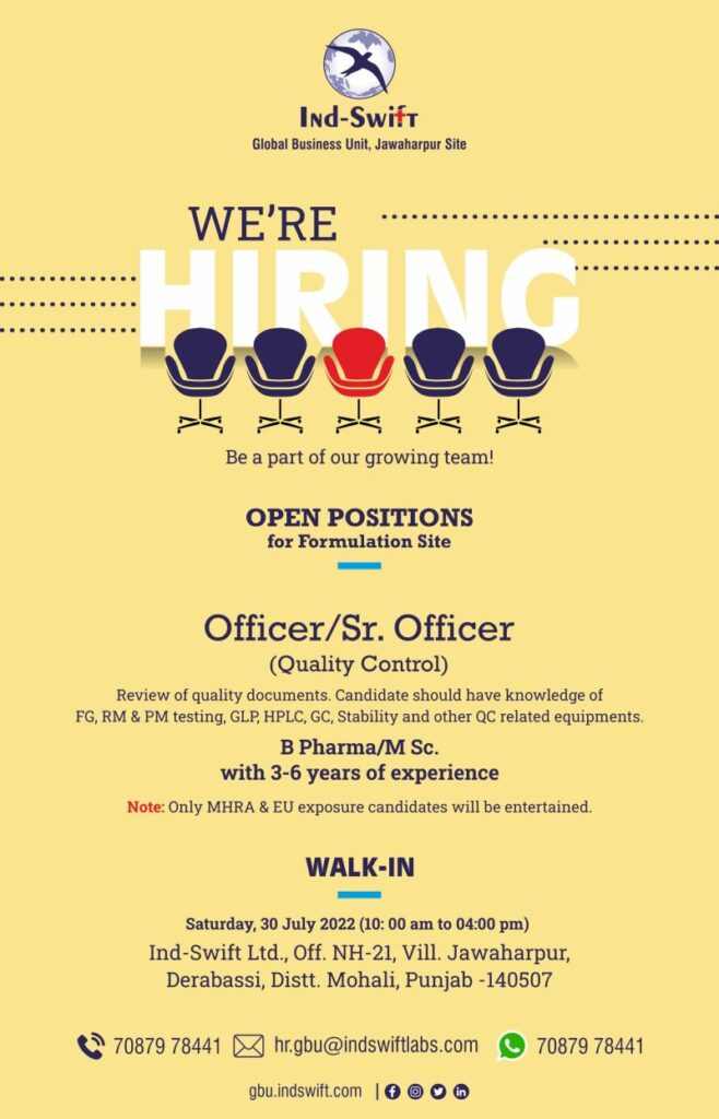 Walk-in interview on 30 July, 2022 (10 am-4 pm) at GBU Site, Jawaharpur, we have open positions in our formulation site in QC for Officer/Sr. Officer.