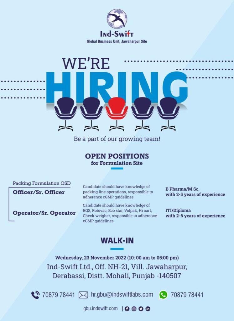 Ind-Swift-Laboratories Ltd. Walk In Interview for Operator/ Sr. Operator/ Officer/ Sr. Officer – Formulation OSD Packing department on 23rd November 2022
