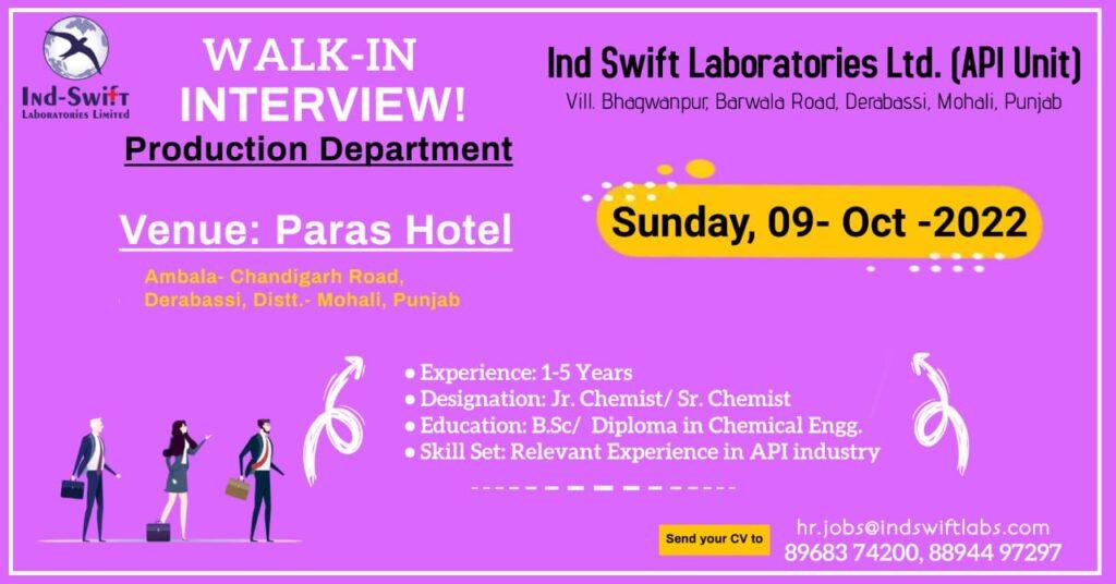 Ind Swift Laboratories Ltd. Walk In Interview for Production Department on Sunday, 09th Oct 2022