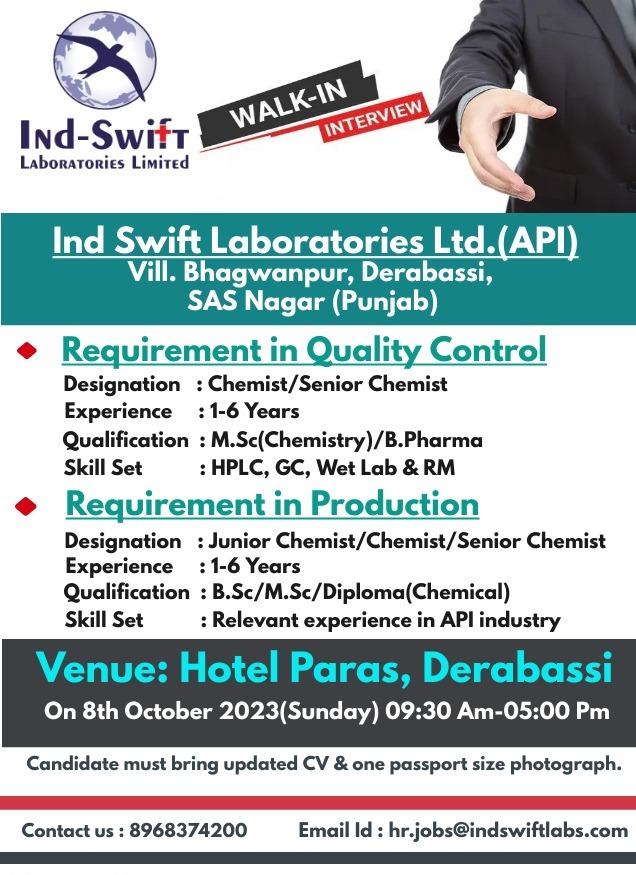 Ind Swift Laboratories Ltd. Walk In Interview for Production & Quality Control on 8th October 2023(Sunday)