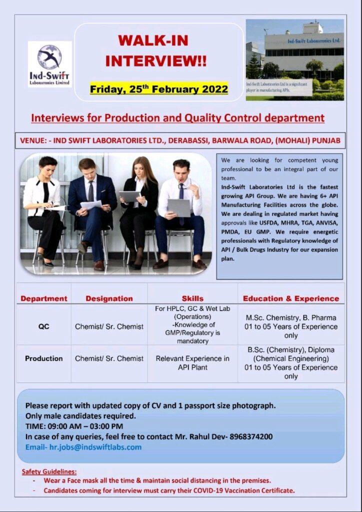 Ind-Swift Laboratories Ltd walk-in interviews for Production & Quality Control on 25th Feb’ 2021