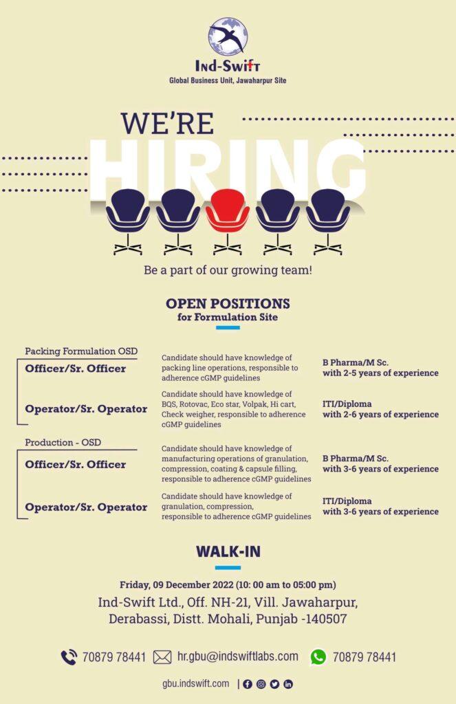 Ind-Swift-Laboratories Walk In Interview for multiple opening in packing and production OSD department at GBU, Jawaharpur Plant.