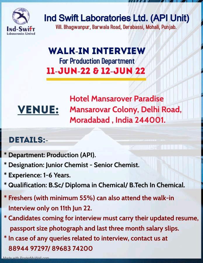 Ind Swift Laboratories Walk In Interview for Production Department 11th & 12th June 2022
