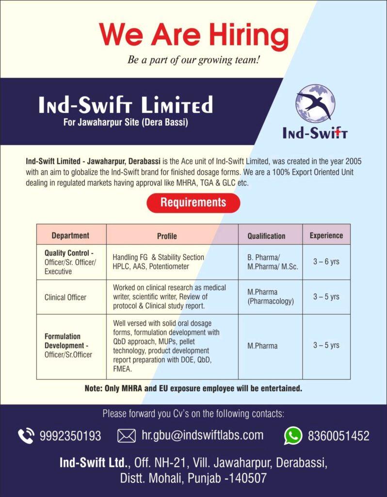 Ind-Swift Limited Quality Control, Clinical and Formulation Development department