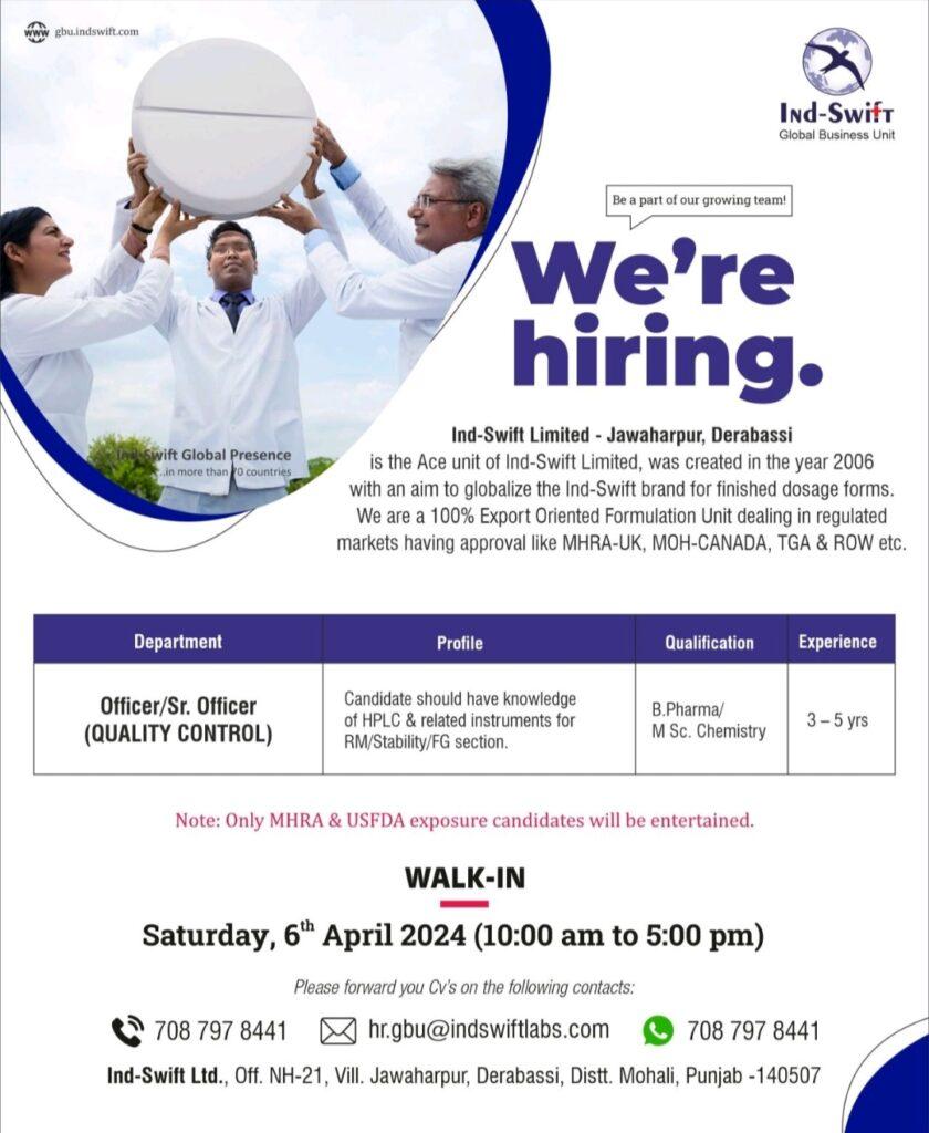 Ind-Swift Limited walk in interview for Officer/ Sr. Officer- Quality Control on 6th April 2024