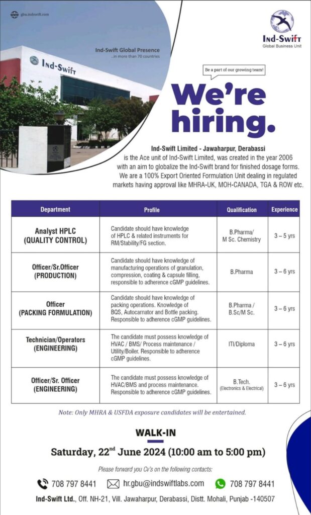 Ind-Swift Limited walk in interview for Technician/ Operators/ Officer/ Sr.Officer- QC, Engineering, Production & Packing on 22nd June 2024