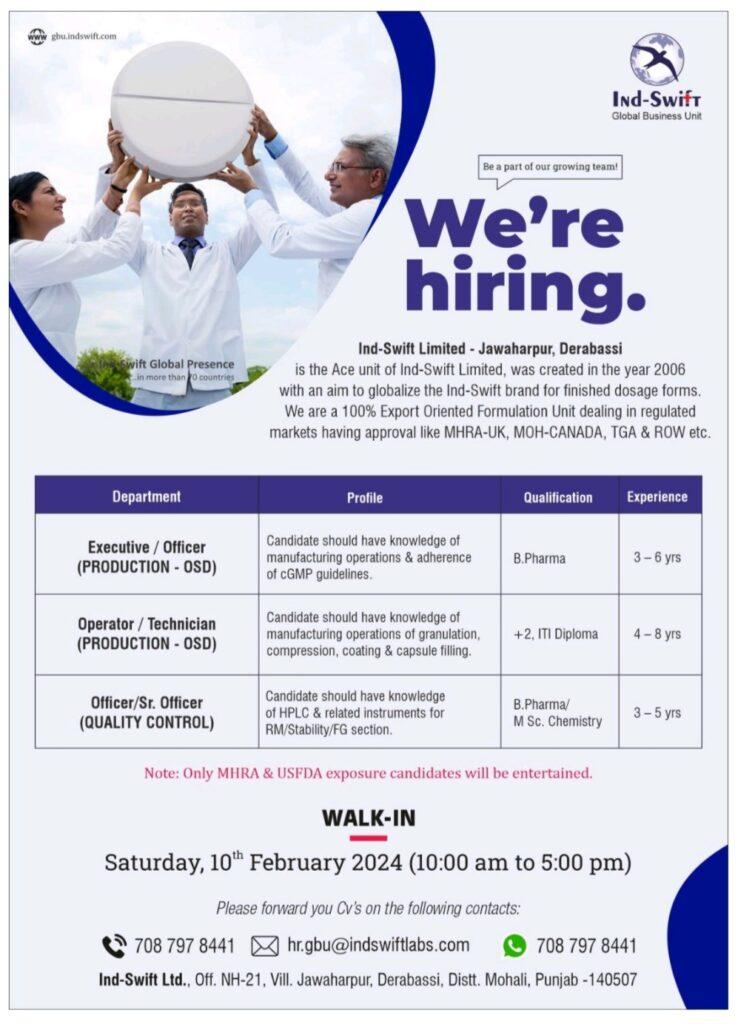 Ind-Swift Ltd. (GBU Plant) is hiring for positions in the Production and Quality Control departments: Executive/Officer and Operator/Technician in Production, Officer in Quality Control